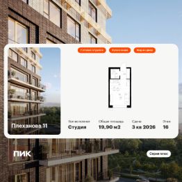 Продаётся квартира-студия площадью 19,9 кв.м на 16 этаже 24 этажного дома (Корпус 1.1, Секция 1) проекта ПИК Плеханова 11. Светлый просторный подъезд на уровне земли, функциональная планировка, большие окна, c отделкой.