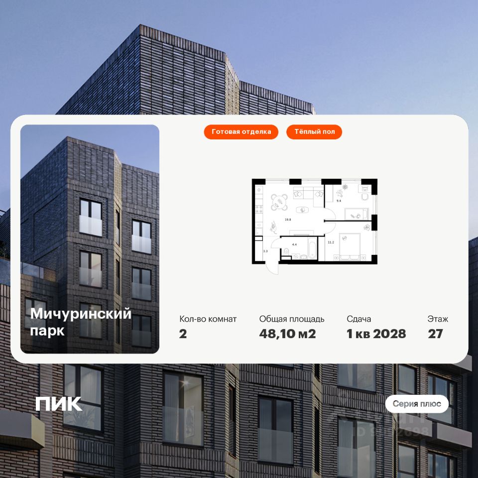 Продаётся 2-комн. квартира площадью 48,1 кв.м на 27 этаже 31 этажного дома (Корпус 4.3, Секция 2) проекта ПИК Мичуринский парк. Светлый просторный подъезд на уровне земли, функциональная планировка, большие окна, c отделкой.