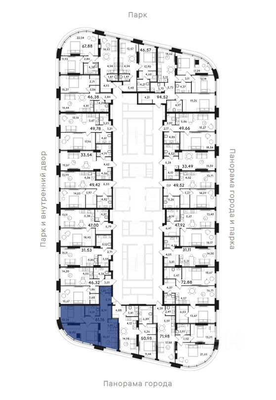 Высота потолков — 3,2 метра, большие окна в пол. В квартирах предусмотрены инженерные решения для акустического комфорта и чистый воздух благодаря близости парка и современным системам вентиляции.