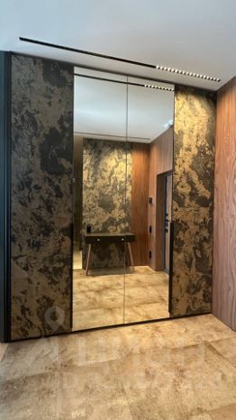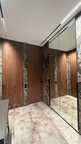 • Встроенный четырёхдверный распашной шкаф, в котором встроена стирально-сушильная машинка Miele.