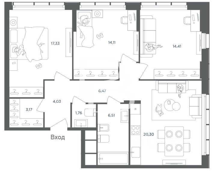 Квартира без отделки. По плану возможно обустроить просторную гостиную - кухню, две спальни, дополнительную комнату под гостевую спальню или кабинет, ванную комнату, гардеробную комнату и гостевой санузел.