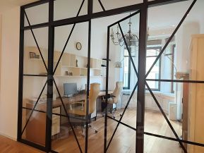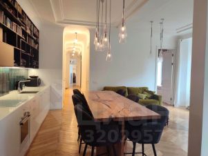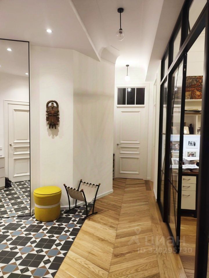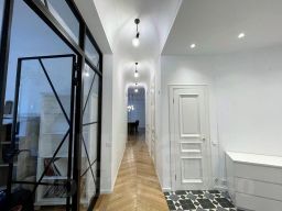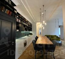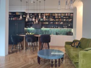 Ремонт делали для себя с заменой перекрытий, всех коммуникаций, проводки. На полу дубовая доска, керамогранит испанских и итальянских производителей. Восстановлена старинная лепнина на потолке, а высокие двери (2,60 м.) дают ощущение воздушности и легкости пространства. Кухонная мебель изготовлена по индивидуальному заказу, стилизирована под библиотеку.