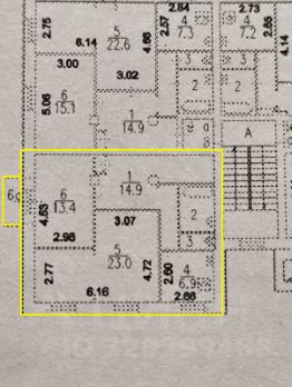 Общая площадь квартиры составляет 64,3 кв. м, жилая площадь — 36,4 кв. м, кухня — 6,9 кв. м., коридор-14,9м кв.м, высота потолков-3,0м. Комнаты изолированные, из одной комнаты выход на балкон (не застеклен). Окна выходят на две стороны дома, во двор и на торцевую сторону, не слышно шума с дороги. Санузел раздельный.