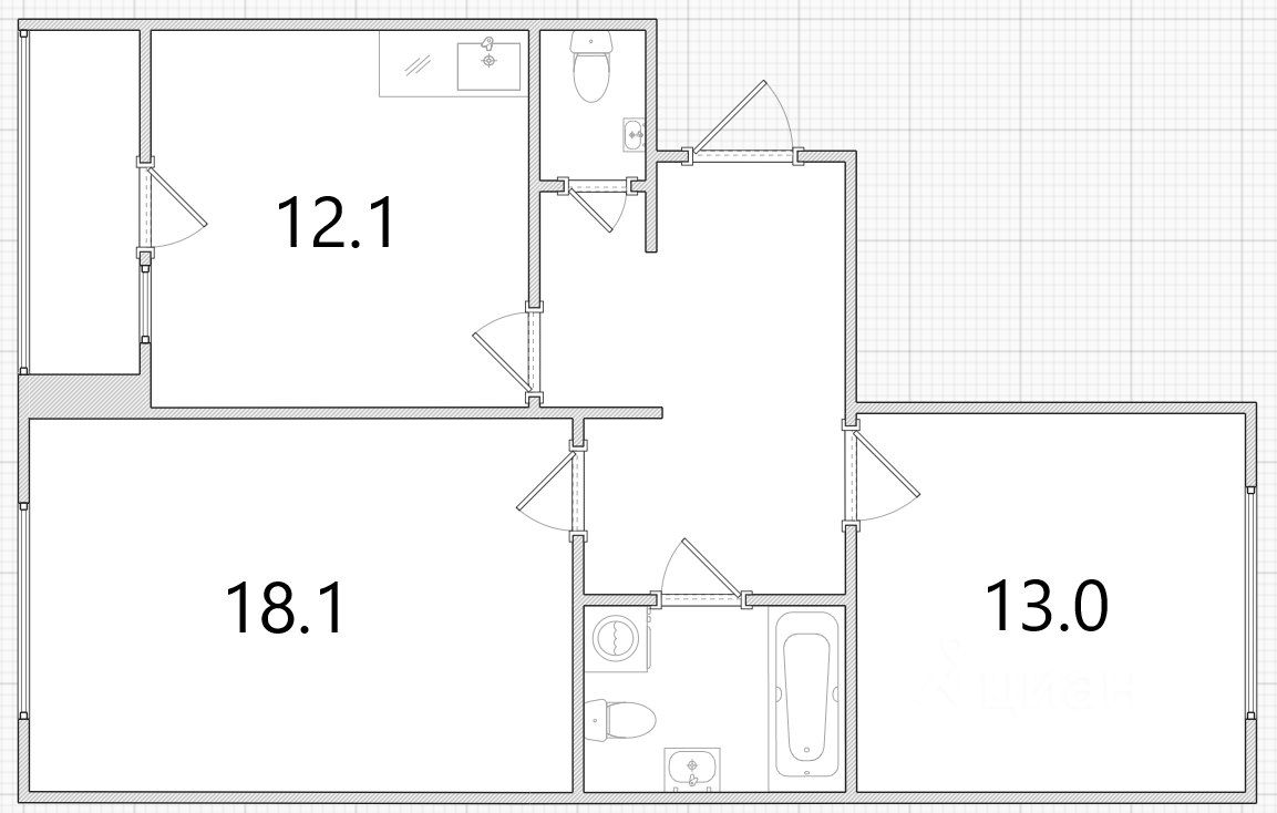 Общая площадь 59.4 кв. м, жилая 31.1 кв. м, кухня 12.1кв.м. Высота потолков 2.6м.Увеличенные оконные проёмы. Два санузла. Лоджия 3кв.м с панорамным остеклением +мы провели свет и установили розетку на лоджии, есть корзина и отверстия для кондиционера. Ремонт косметический, дом в хорошем состоянии .
