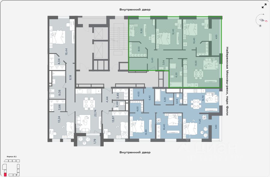 За 5-10 минут на автомобиле можно добраться до парков Фили, Красногвардейские пруды, Красная Пресня и парка Победы.