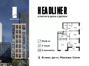 Продаётся 3-комнатная квартира для в ЖК HEADLINER, общей площадью 95,8 кв. м, на 2 этаже. Высота потолков 3 м. Это просторная, светлая квартира подойдет для большой семьи, в ней три полноценные спальни и кухня-гостиная. В квартире предусмотрено 2 санузла и 3 гардеробные комнаты. Окна в квартире выходят на разные стороны, также в квартире есть лоджия. В квартире выполнена предчистовая отделка White box. Дом сдан.