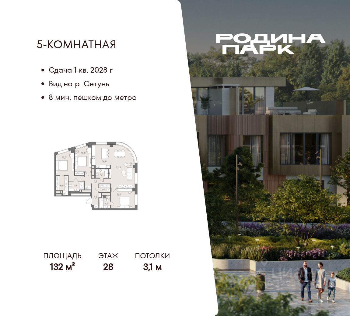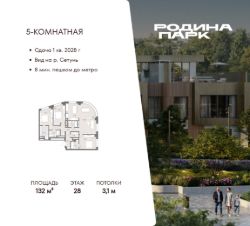 В жилом кластере Родина Парк рядом с природным заказником Долина реки Сетунь продаётся 5-комнатная квартира. Современный проект премиум-класса в Западном районе Москвы. Инновационный кластер Родина Парк представляет собой 5 жилых корпусов от 11 до 35 этажей, а также комплекс из 15 двухэтажных таунхаусов с террасами и эксплуатируемой кровлей. Также в проекте будет реализован деловой центр и многофункциональный комплекс со спортивной и развлекательной функцией. Расположение: - 8 минут до м. Давыдково - 15 минут до м. Славянский бульвар - 12 минут на авто до нового Арбата - 18 минут на авто до Москва-Сити Инфраструктура: - Рядом с проектом филиалы МГУ, МГТУ, МФЮА, а также Инновационный центр Сколково. - В 10 минутах езды находятся 6 школ из списка Forbes лучших частных общеобразовательных учреждений Москвы и области. - Свой детский сад на 95 мест, который будет построен на территории кластера. Внутреннее благоустройство: - Приватный двор-парк площадью 9000 кв.м - Детские площадки - Воркаут зоны - Ресторанная зона с летними верандами и фуд-холлом Лобби: - 5 тематических лобби в индивидуальном стиле - Лаунж-зоны - Игровые комнаты - Переговорные - Фитнес-зал - Подземный паркинг - Колясочные