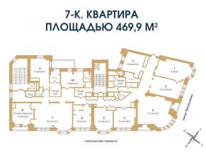 Уникальная 7-комнатная квартира площадью 469,9 квадратных метров радует функциональной планировкой: просторная кухня, столовая с колоннами, гостиная с камином, две спальни и две детские комнаты с собственными санузлами, кабинет и комната для занятий спортом. Дорогая дизайнерская отделка с лепниной, дубовым паркетом и использованием натурального камня создает атмосферу уюта и роскоши. Высота потолков 3,8 м и панорамное остекление наполняют пространство светом и воздухом.