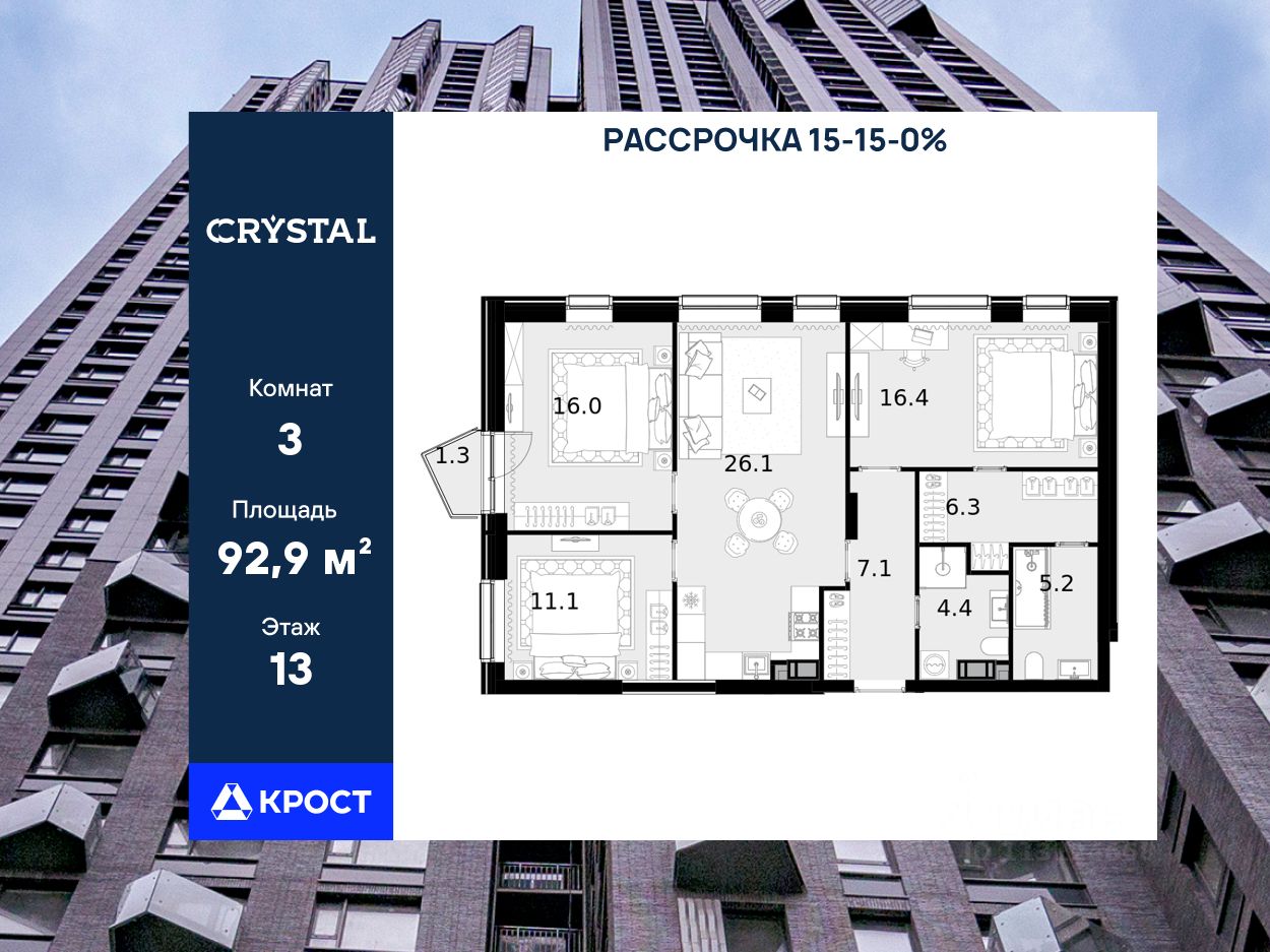 Однокомнатная квартира площадью 92,9 кв.м. на 13 этаже дома бизнес-класса "CRYSTAL Трилогия".
