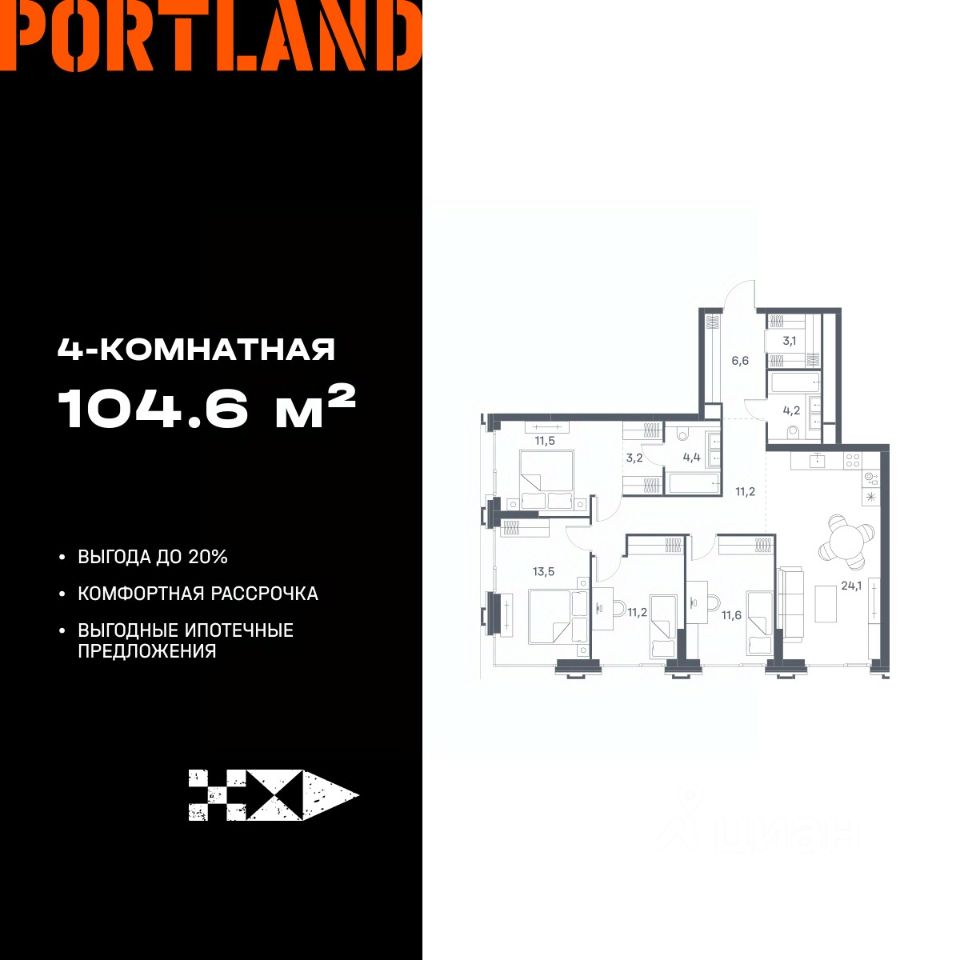 Продаётся 4-к. квартира, 22 этаж в жилом комплексе бизнес-класса Portland от девелопера FORMA. ЖК расположен на берегу Москвы-реки в северной части района Печатники в акватории Южного речного порта.