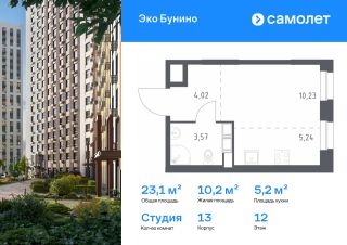 Предлагается квартира студия комфорт-класса 23,06 кв.м в корпусе 13 на 12 этаже, в ЖК "Эко Бунино"