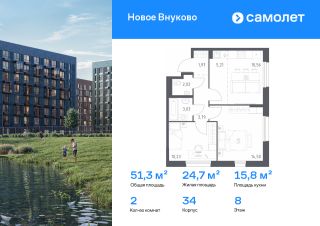 Предлагается 2-комнатная квартира комфорт-класса 51,31 кв.м в корпусе 34 на 8 этаже, в ЖК "Новое Внуково"