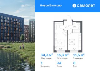 Предлагается 1-комнатная квартира комфорт-класса 34,29 кв.м в корпусе 34 на 8 этаже, в ЖК "Новое Внуково"