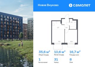Предлагается 1-комнатная квартира комфорт-класса 35,6 кв.м в корпусе 31 на 8 этаже, в ЖК "Новое Внуково"