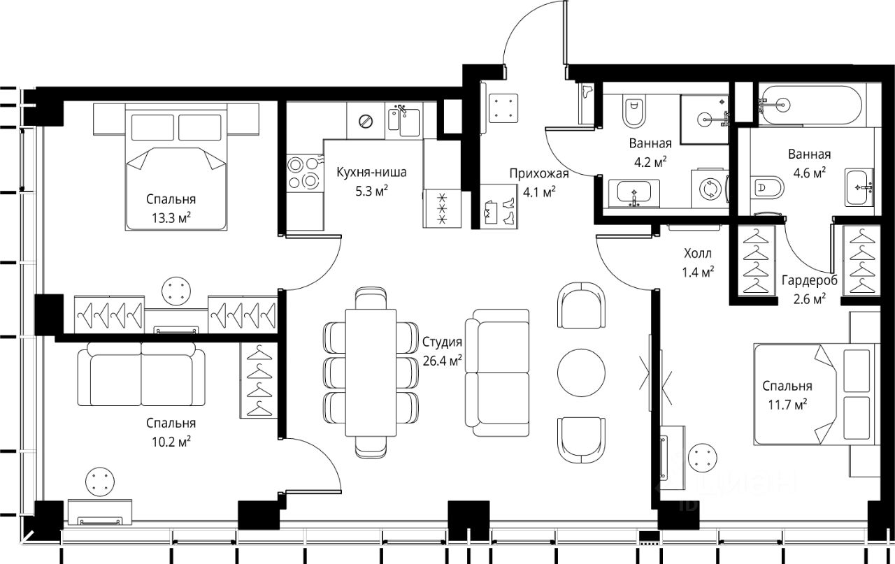 Высота потолков 3 - 6 метров, окна высотой до 2,6 м.