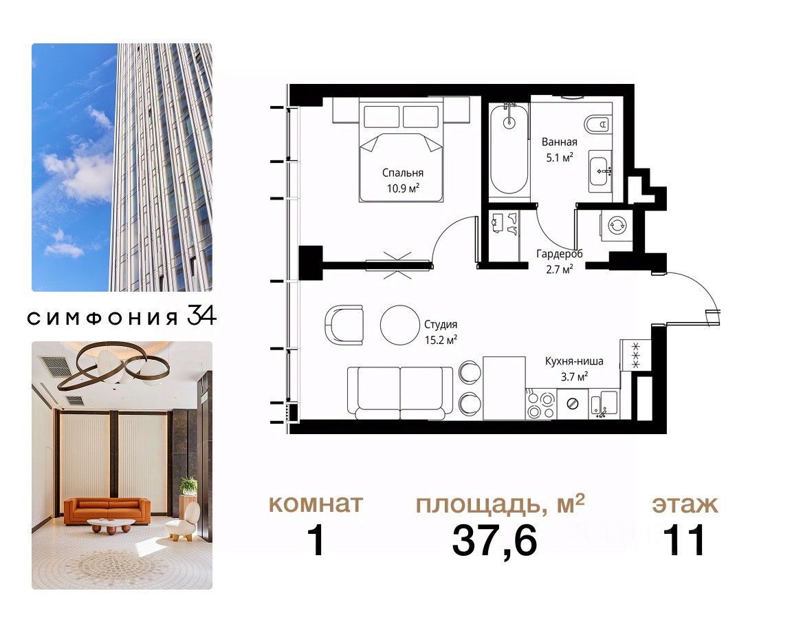В продаже 1-комнатная квартира площадью 37.60 м² с предчистовой отделкой на 11 этаже 43 этажного дома в корпусе Сильвер.
