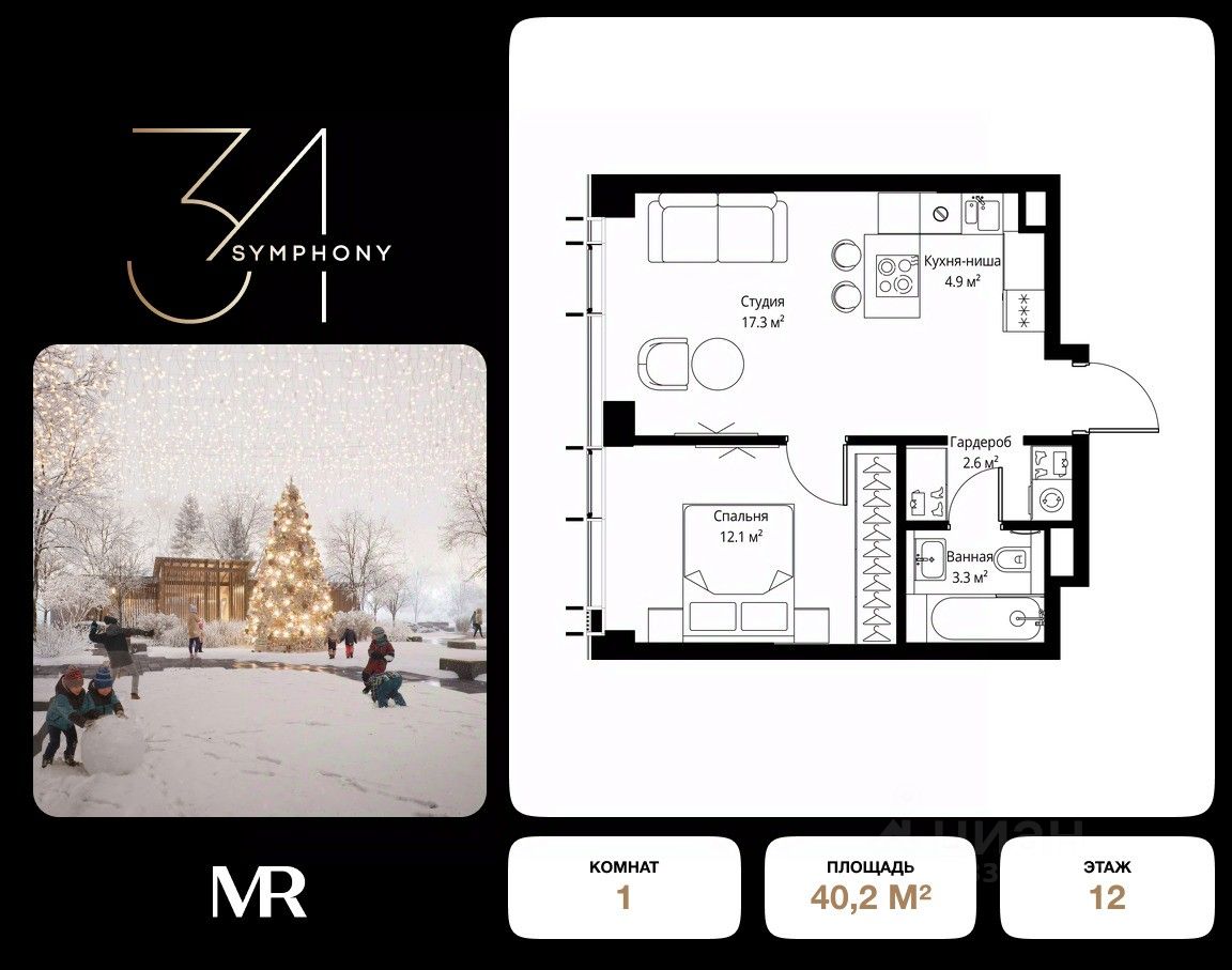 В продаже 1-комнатная квартира площадью 40.20 м² с предчистовой отделкой на 12 этаже 43 этажного дома в корпусе Сильвер.