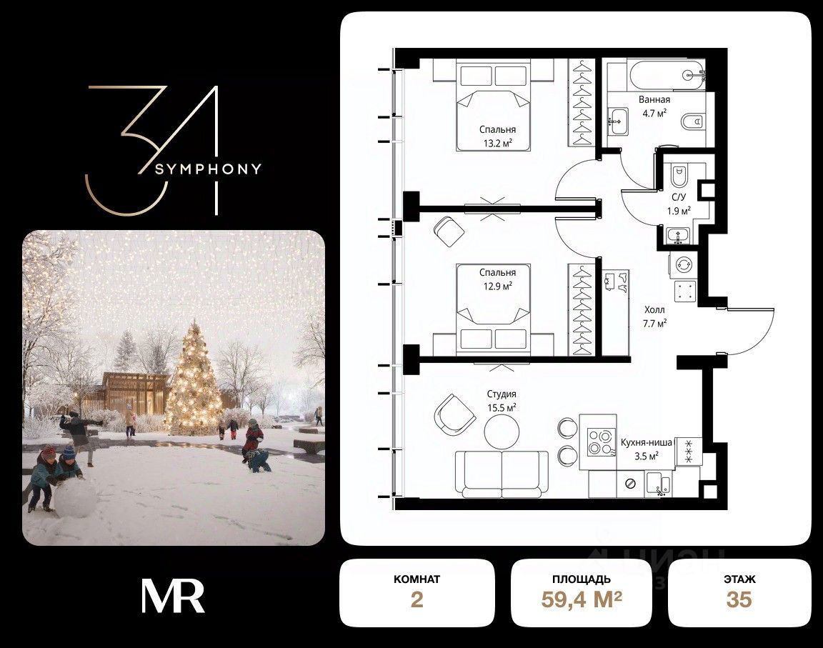 В продаже 2-комнатная квартира площадью 59.40 м² с предчистовой отделкой на 35 этаже 43 этажного дома в корпусе Сильвер.
