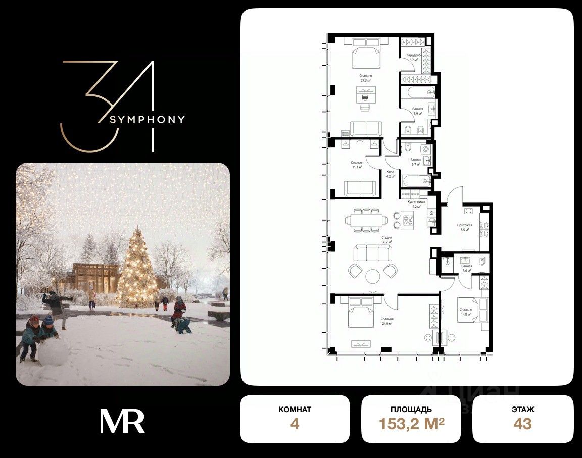 В продаже 4-комнатная квартира площадью 153.20 м² с предчистовой отделкой на 43 этаже 43 этажного дома в корпусе Сильвер.