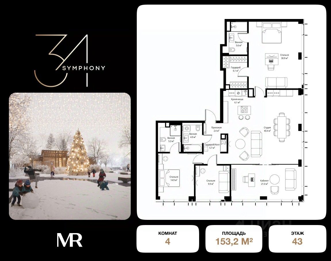 Дом сдан. Ключи в день покупки! В продаже 4-комнатная квартира площадью 153.20 м² с предчистовой отделкой на 43 этаже 43 этажного дома в корпусе Сильвер. ЖК Симфония 34 - концептуально новый жилой комплекс премиум-класса с подземной парковкой, состоит из четырех башен высотой 36 - 54 этажа. Квартиры сдаются с базовой (предчистовой) отделкой MR BASE или дизайнерской чистовой отделкой MR READY. Высота потолков 3 - 6 метров, окна высотой до 2,6 м. Более 100 кладовых в подземной части ЖК и более 500 на этажах. Безопасность - Система контроля входа на территорию комплекса, биометрия - Система автоматического водяного пожаротушения и противопожарного водопровода, система пожарной вентиляции - Доступ на парковку при помощи системы распознавания автомобильных номеров, карточка для контроля доступа резидентов - Система видеонаблюдения - Круглосуточная связь через приложение, телефон, голосовые сообщения с охраной, консьержем, call-центр. Расположение Пешком - 6 минут до метро "Дмитровская" - 15 минут до Тимирязевского парка На машине - 5 минут до Савеловского вокзала и Аэроэкспресса в Шереметьево - 10 минут до Москва-Сити и Садового кольца Благоустройство - 70% территории отведены под зеленые насаждения и ландшафтный дизайн - Приватный Японский сад - Детские площадки с зонированием по возрасту - Clubhouse для резидентов - Wellness & SPA - Зона для пикника, зона с гамаками - Центральное лобби, ресторан, коммерческие помещения - Дополнительный вход/выход на территорию комплекса Окружение - В 10 минутах от Symphony 34 находится дизайн-завод Flacon, где регулярно проходят культурно-образовательные и развлекательные мероприятия - Тимирязевский парк расположен в 850 м. Площадь парка 232 га - Рядом расположен парк "Дубки", площадью 16,5 га. - В 15 минутах расположен Хлебозавод 9. Здесь находятся шоурумы брендов, кафе разных кухонь мира, образовательные проекты и площадки для мероприятиКомпания MR предлагает своим клиентам специальные условия приобретения квартир в рамках программ ипотечного кредитования от банков-партнеров.