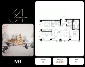 В продаже 3-комнатная квартира площадью 86.20 м² с предчистовой отделкой на 11 этаже 43 этажного дома в корпусе Сильвер.