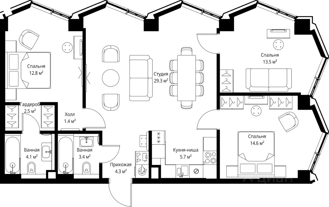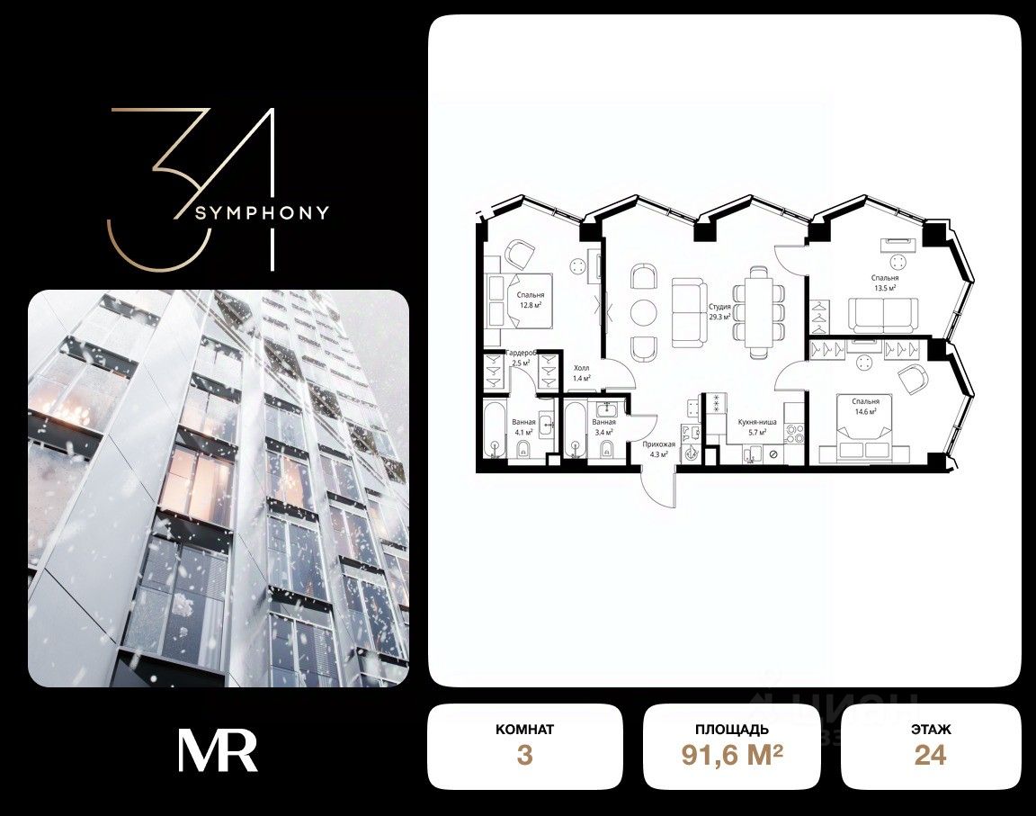 В продаже 3-комнатная квартира площадью 91.60 м² с предчистовой отделкой на 24 этаже 49 этажного дома в корпусе Кристал.