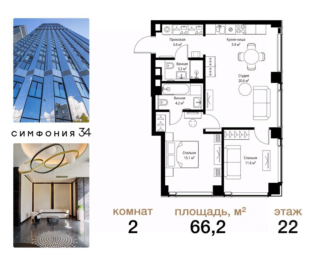 В продаже 2-комнатная квартира площадью 66.20 м² с предчистовой отделкой на 22 этаже 49 этажного дома в корпусе Кристалл.
