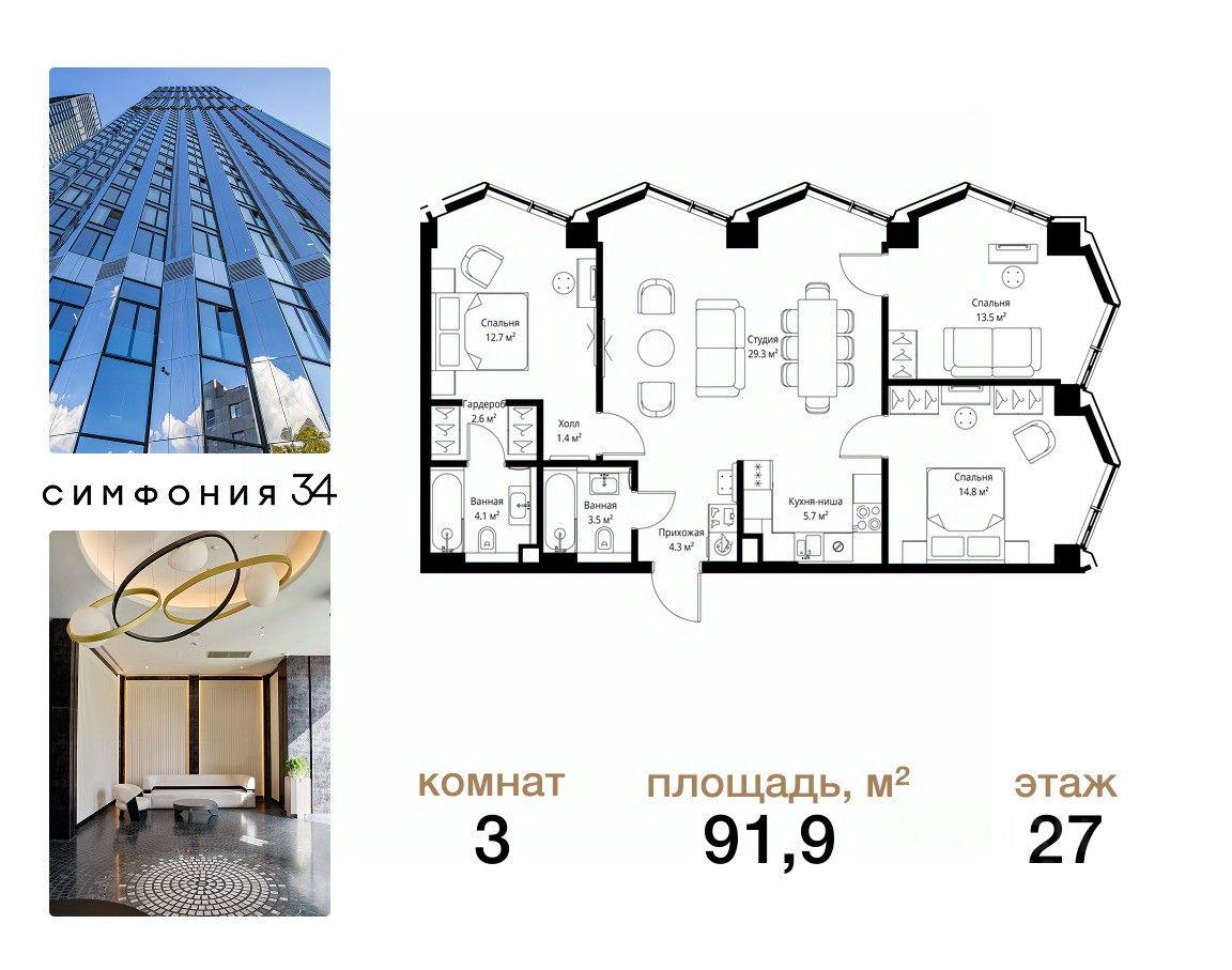 В продаже 3-комнатная квартира площадью 91.90 м² с предчистовой отделкой на 27 этаже 49 этажного дома в корпусе Кристалл.