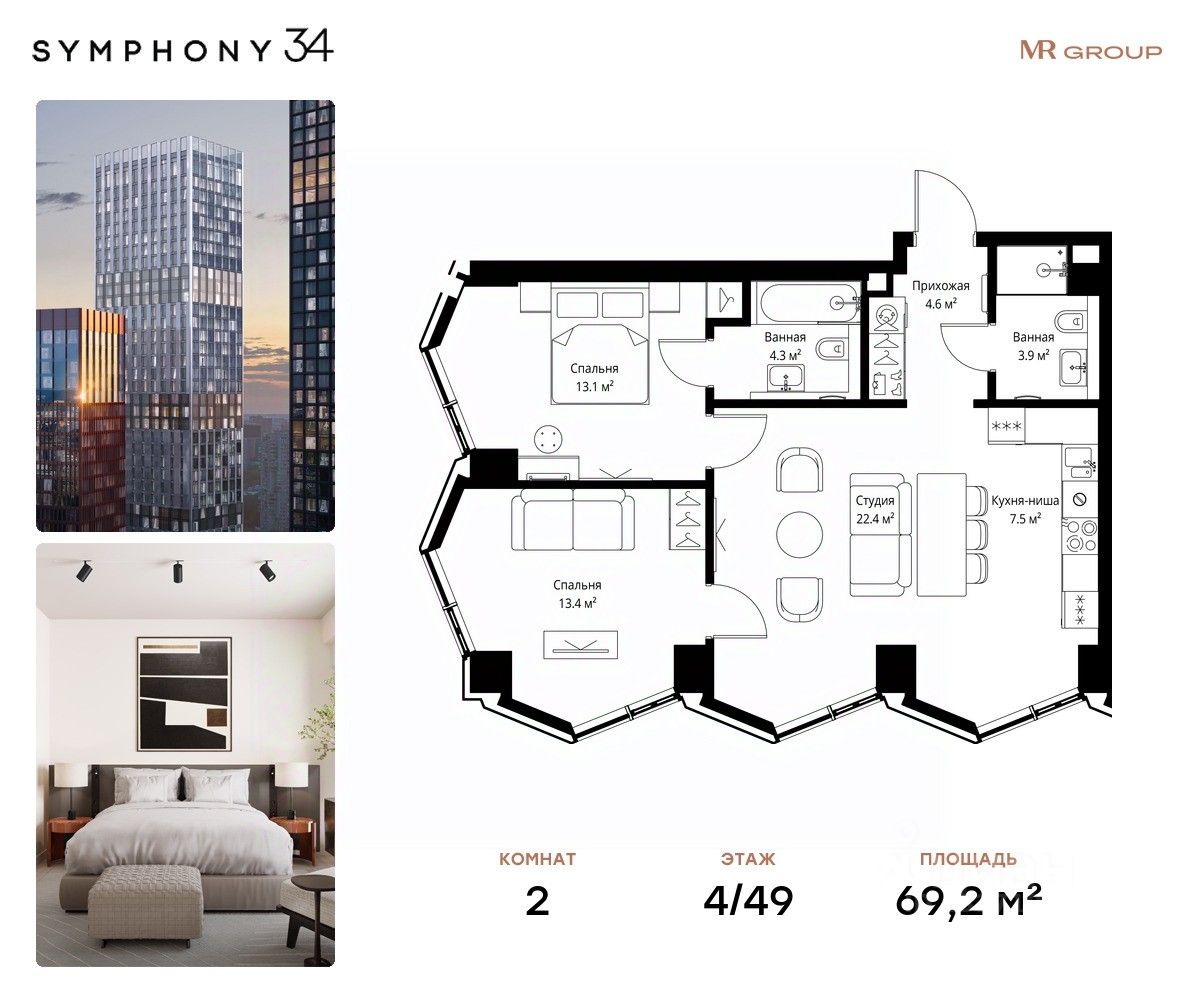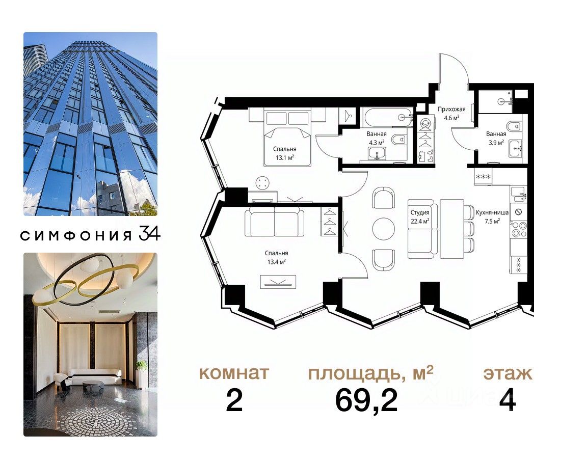 ЖК Симфония 34 - концептуально новый жилой комплекс премиум-класса с подземной парковкой, состоит из четырех башен высотой 36 - 54 этажа.