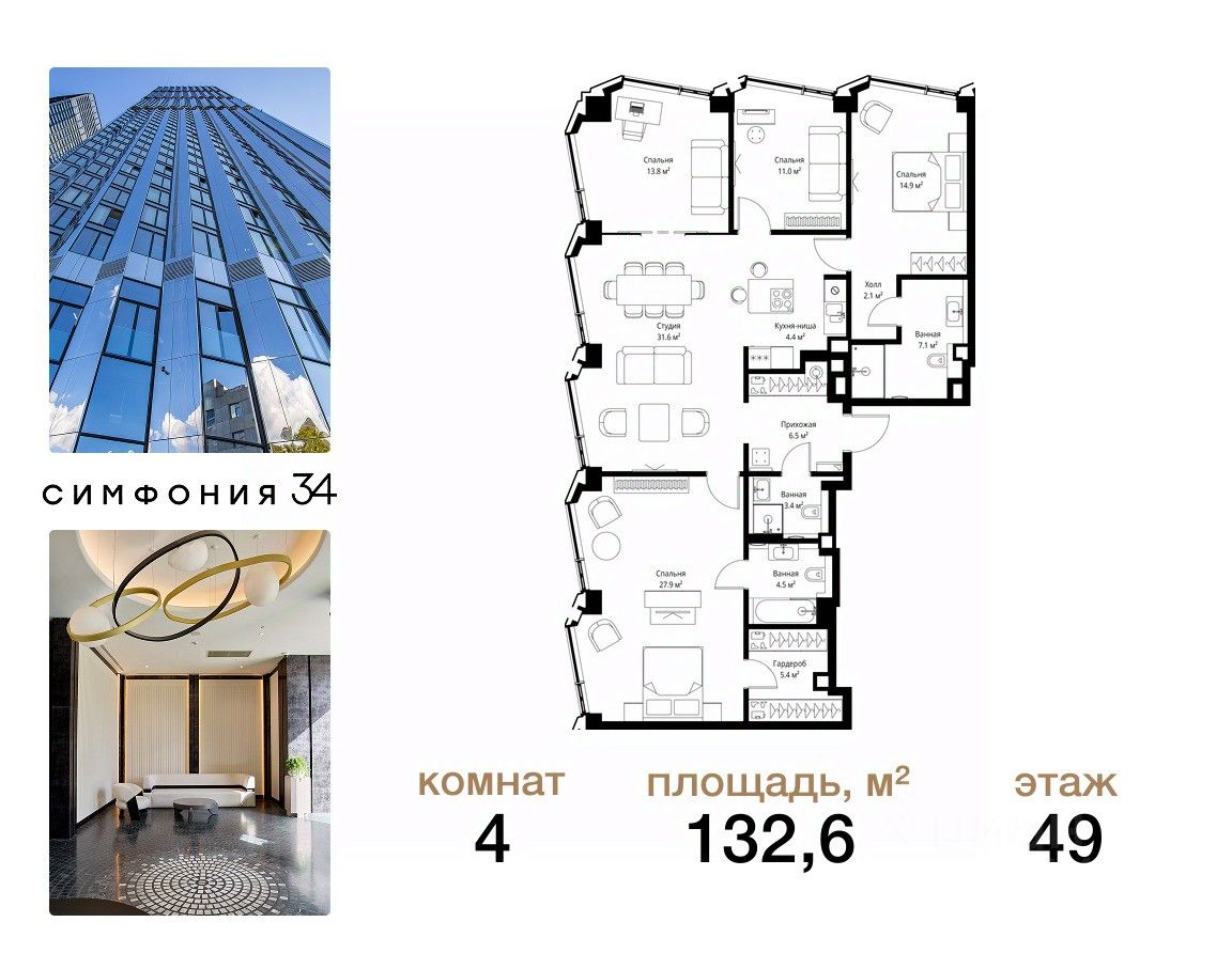 В продаже 4-комнатная квартира площадью 132.60 м² с предчистовой отделкой на 49 этаже 49 этажного дома в корпусе Кристал.
