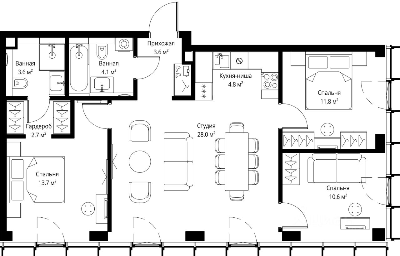 Высота потолков 3 - 6 метров, окна высотой до 2,6 м.