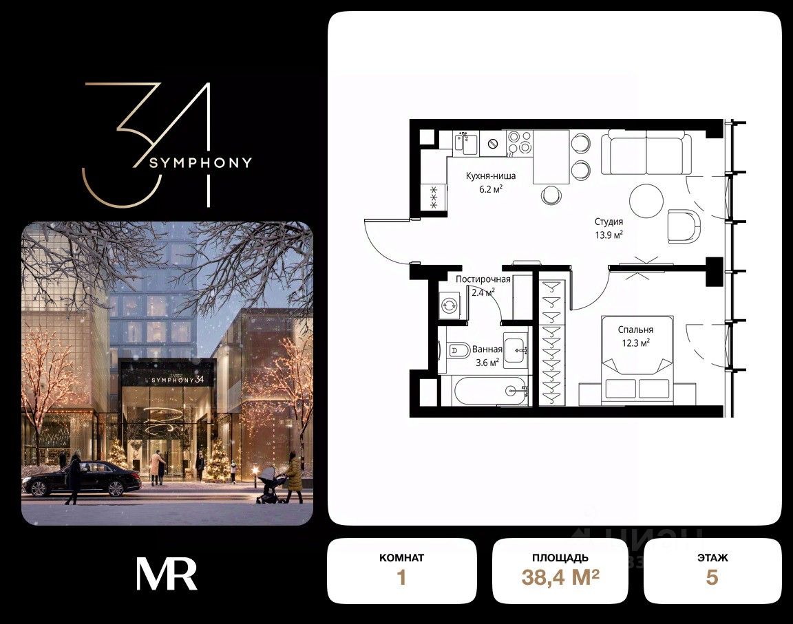 В продаже 1-комнатная квартира площадью 38.40 м² с чистовой отделкой на 5 этаже 36 этажного дома в корпусе Сиена.