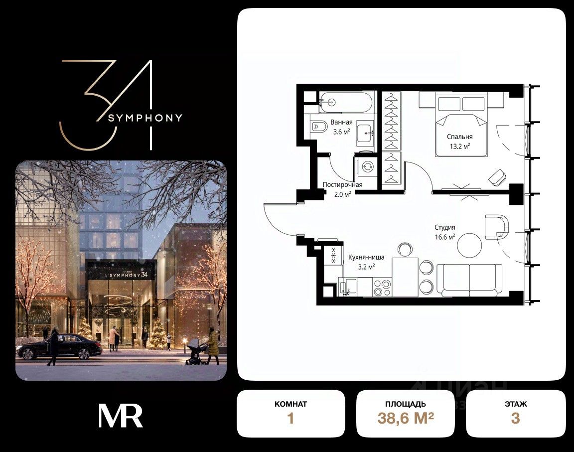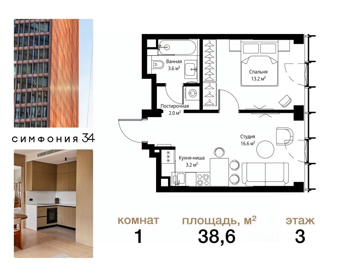 В продаже 1-комнатная квартира площадью 38.60 м² с чистовой отделкой на 3 этаже 36 этажного дома в корпусе Сиена.