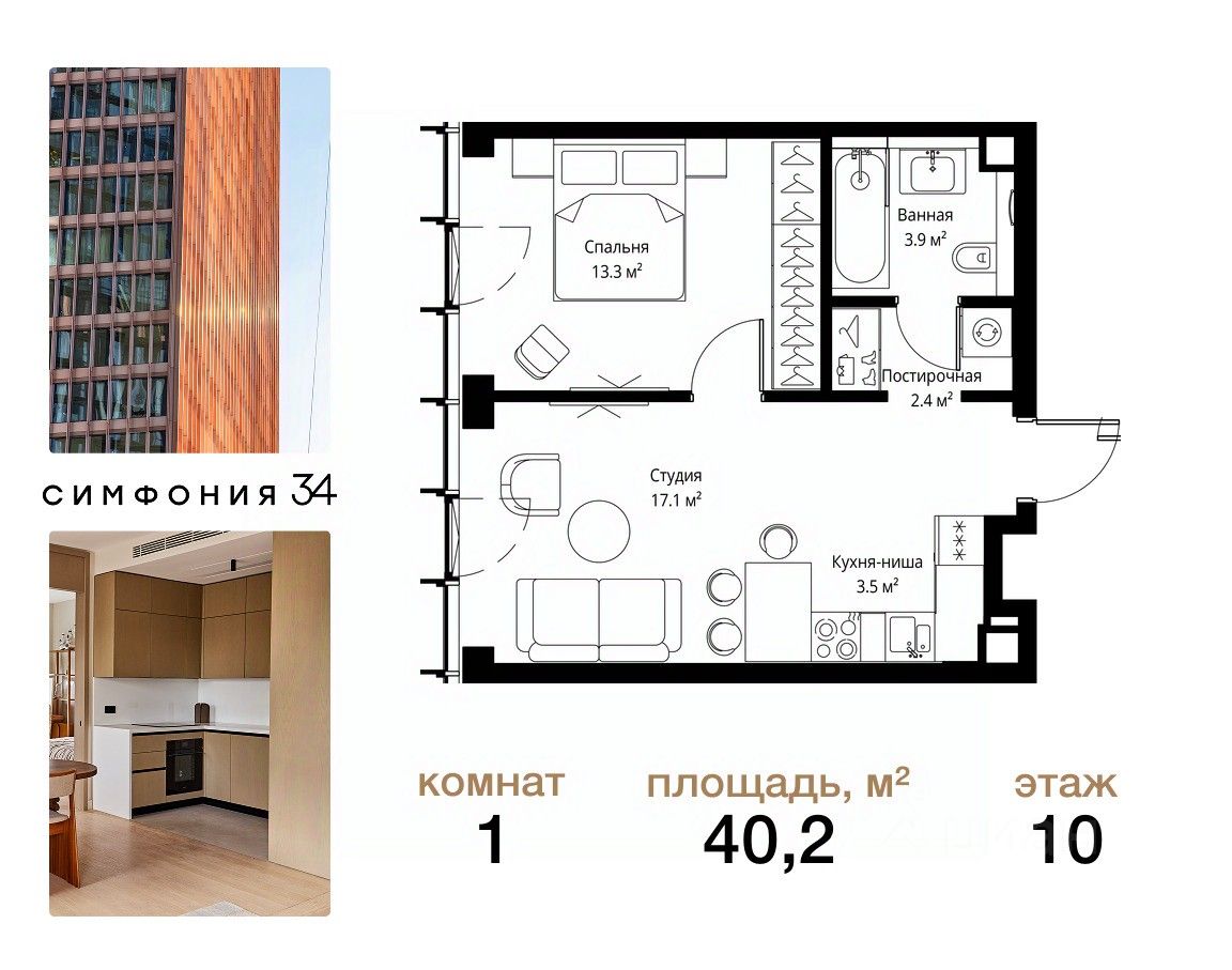 В продаже 1-комнатная квартира площадью 40.20 м² с чистовой отделкой на 10 этаже 36 этажного дома в корпусе Сиена.