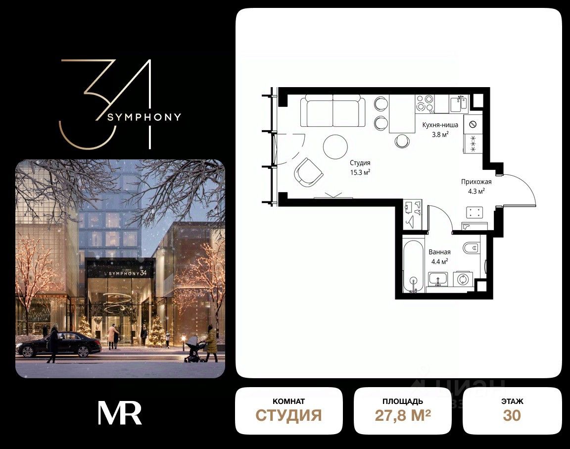 В продаже студия площадью 27.80 м² с чистовой отделкой на 30 этаже 36 этажного дома в корпусе Сиена.