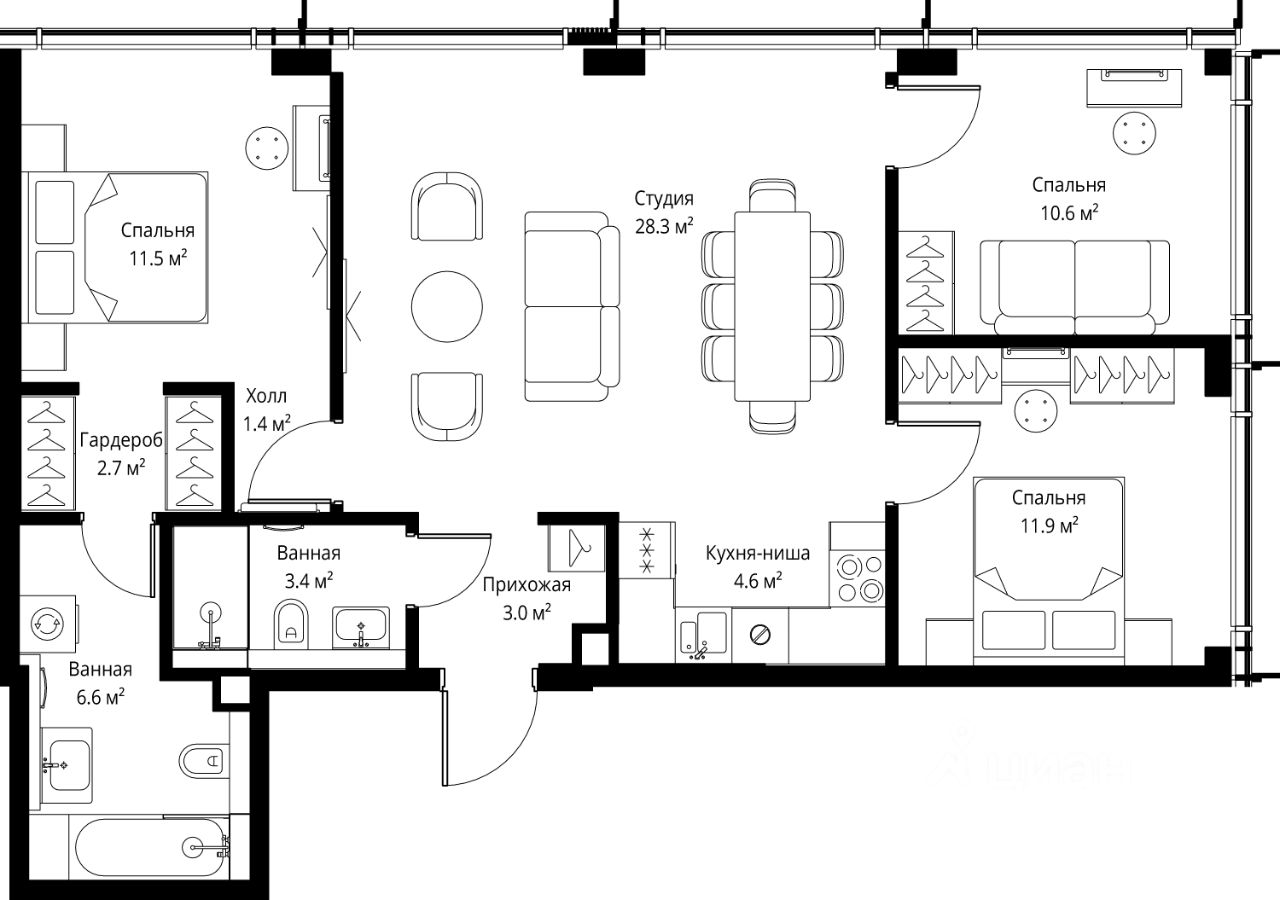 Высота потолков 3 - 6 метров, окна высотой до 2,6 м.