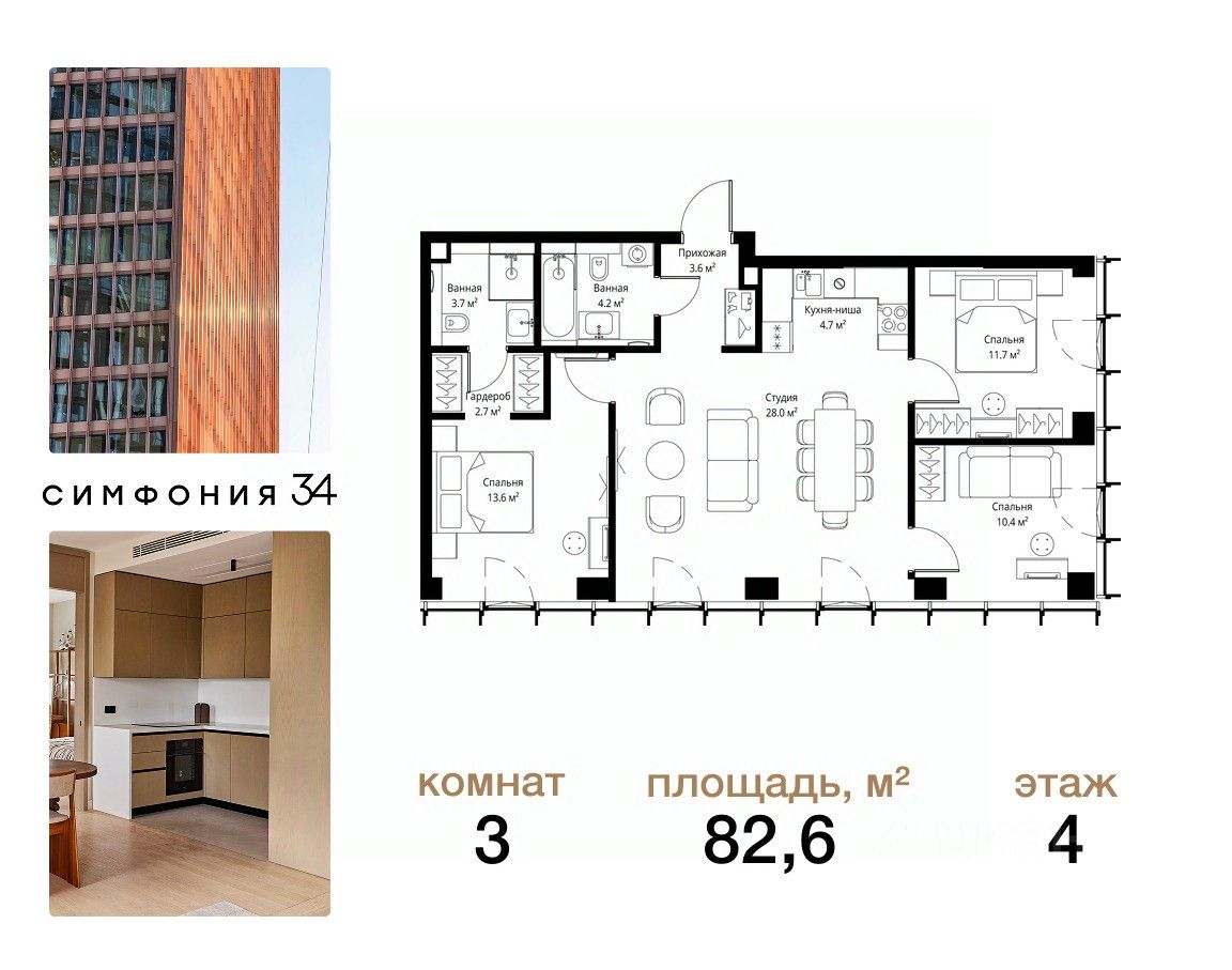В продаже 3-комнатная квартира площадью 82.60 м² с чистовой отделкой на 4 этаже 36 этажного дома в корпусе Сиена.