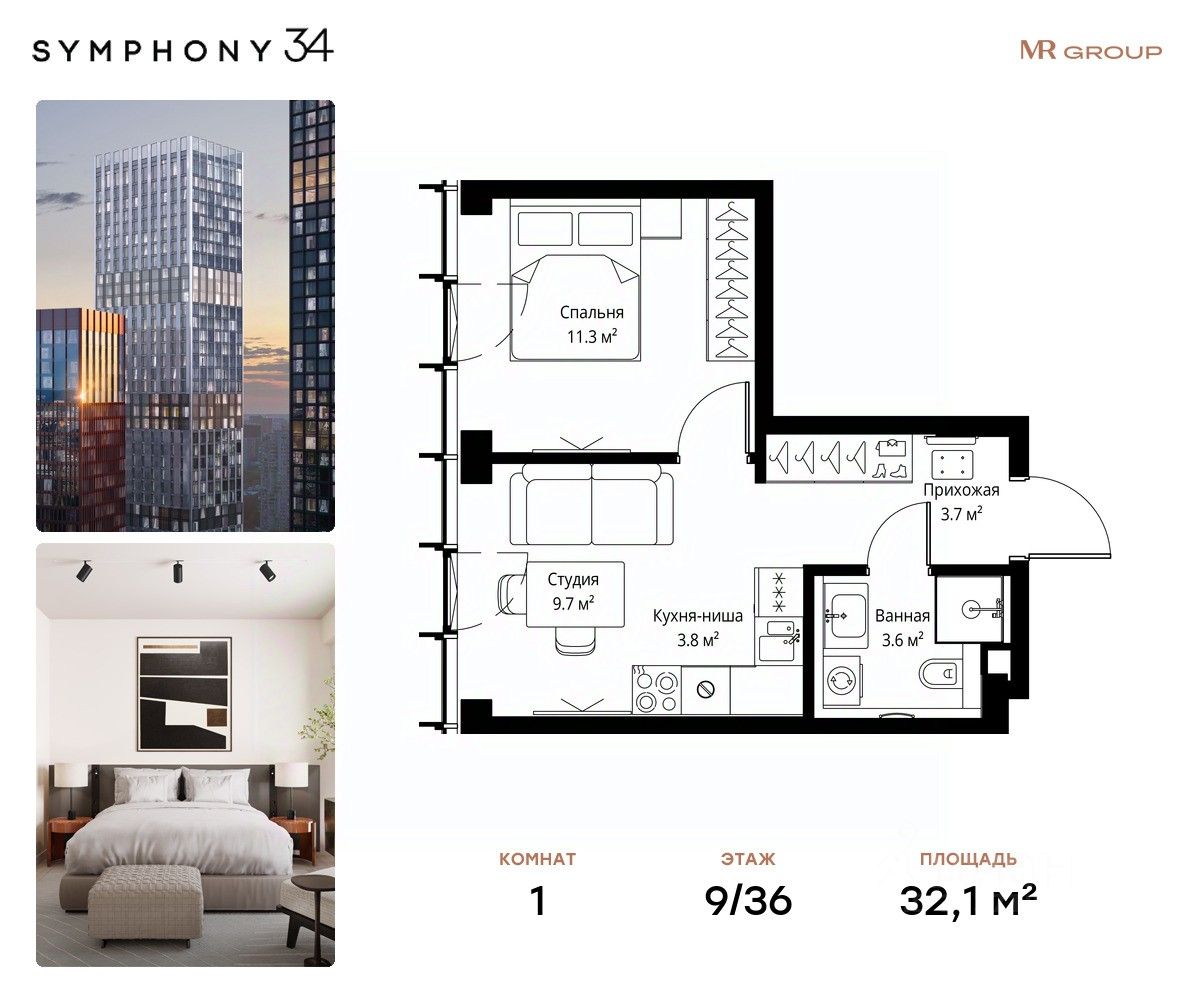 В продаже 1-к квартира площадью 32.10 м² с чистовой отделкой на 9 этаже 36 этажного дома в корпусе Сиена.