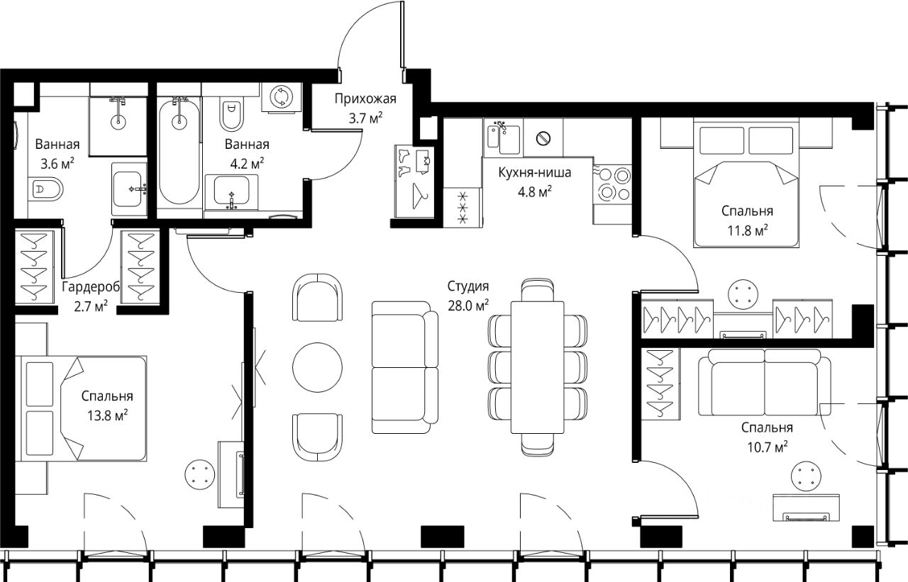 Высота потолков 3 - 6 метров, окна высотой до 2,6 м.