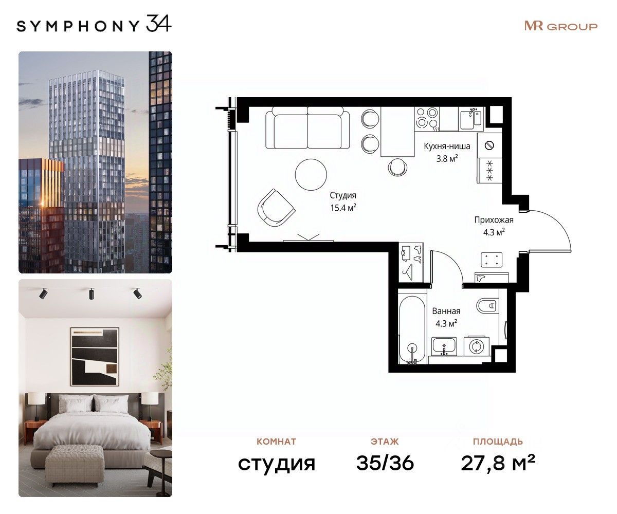 В продаже студия площадью 27.80 м² с чистовой отделкой на 35 этаже 36 этажного дома в корпусе Сиена.