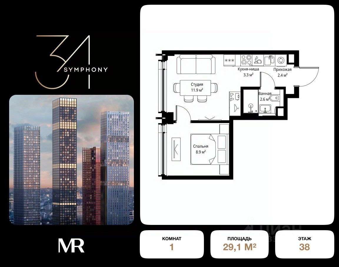 В продаже 1-комнатная квартира площадью 29.10 м² с предчистовой отделкой на 38 этаже 54 этажного дома в корпусе Графит.