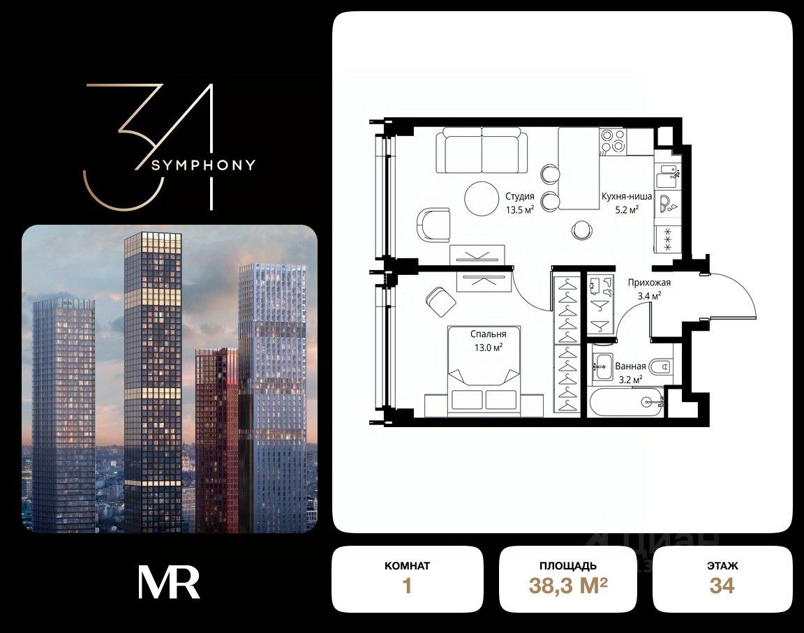 В продаже 1-комнатная квартира площадью 38.30 м² с предчистовой отделкой на 34 этаже 54 этажного дома в корпусе Графит.