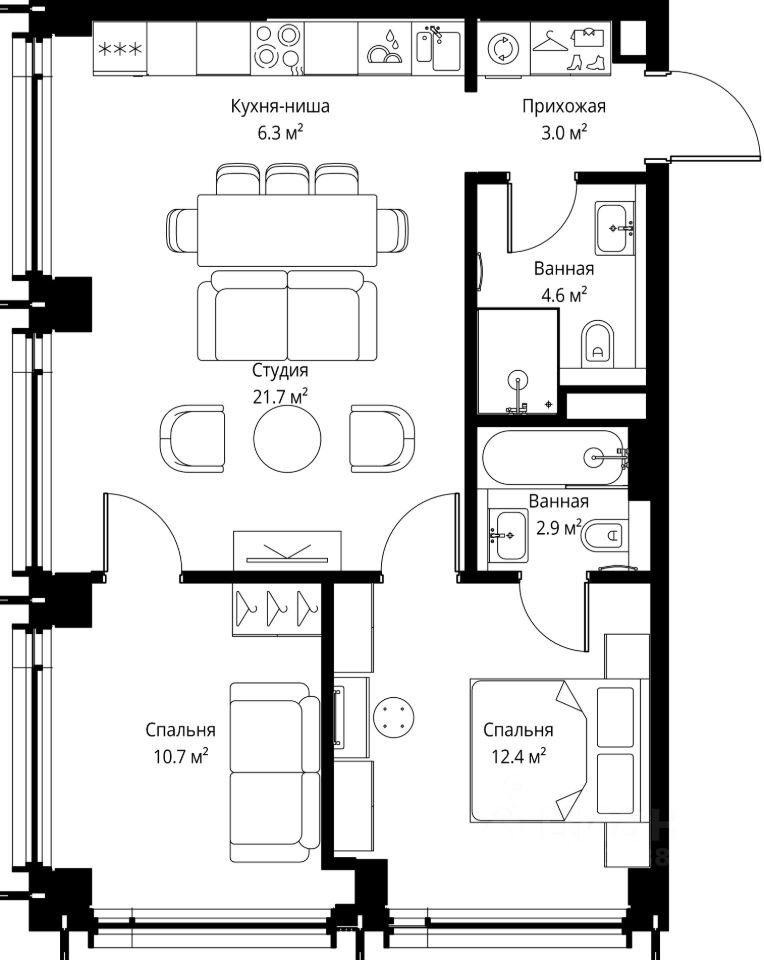 В продаже 2-комнатная квартира площадью 61.60 м² с предчистовой отделкой на 24 этаже 54 этажного дома в корпусе Графит.