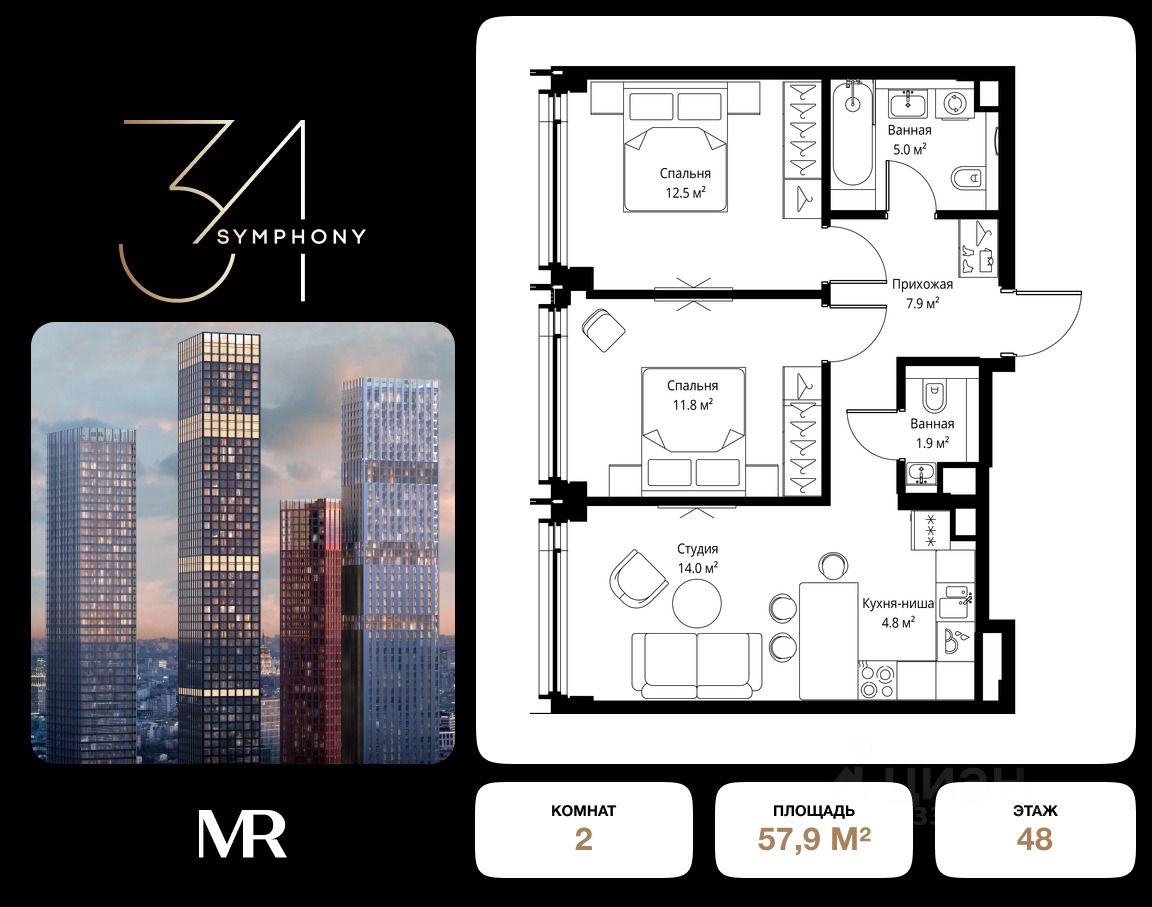 В продаже 2-комнатная квартира площадью 57.90 м² с предчистовой отделкой на 48 этаже 54 этажного дома в корпусе Графит.