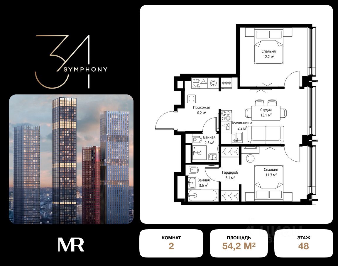 В продаже 2-комнатная квартира площадью 54.20 м² с предчистовой отделкой на 48 этаже 54 этажного дома в корпусе Графит.