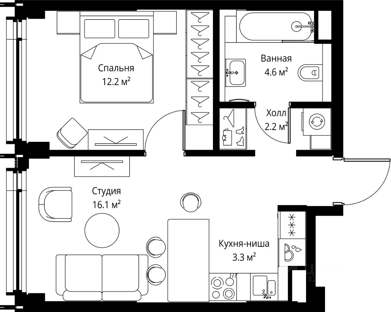 В продаже 1-комнатная квартира площадью 38.40 м² с предчистовой отделкой на 25 этаже 54 этажного дома в корпусе Графит.