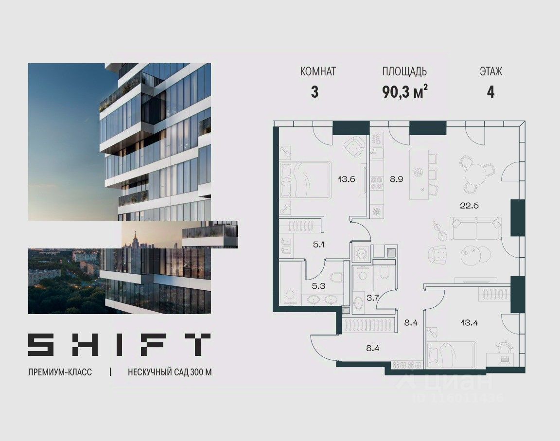 3-к квартира в премиальном комплексе SHIFT на 4-м этаже в 18 этажном здании. Общая площадь 90.3 кв. м.