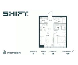 2-к квартира в премиальном комплексе SHIFT на 4-м этаже в 18 этажном здании. Общая площадь 48 кв. м.