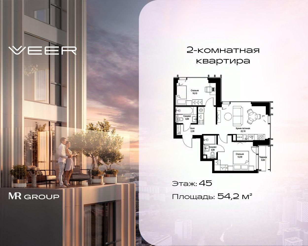 Продаётся 2-к квартира общей площадью 54.20 м² без отделки в ЖК VEER на 45-м этаже 59 этажного дома.