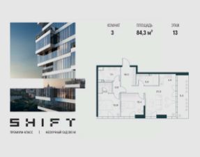 3-к квартира в премиальном комплексе SHIFT на 13-м этаже в 18 этажном здании. Общая площадь 84.3 кв. м.